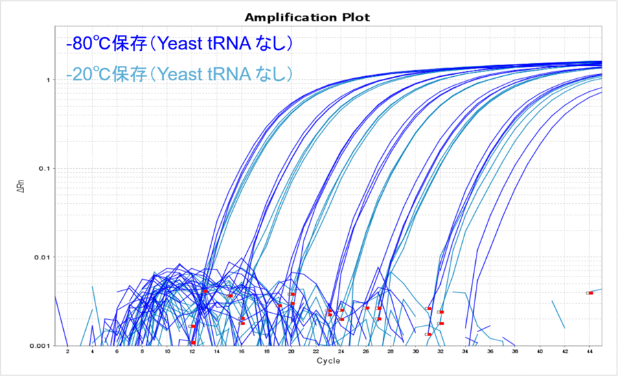 -80℃で保存した場合のYeast tRNA添加の有無を比較してみると、Yeast tRNAなしの場合はCT値が高くなり、リアルタイムPCRで検出できるサンプル量が目減りしていることがわかりました(表3、図3)。希釈する前のDNAサンプルは、凍結融解を1度もすることなく-80℃で保管していたものなので、DNAの分解というよりはDNAのチューブへの吸着をYeast tRNA添加によって防げたことを示唆している結果だと考えました。