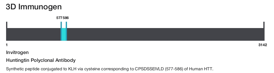 Human HTT caspase cleavage sites generate fragment-specific forms of the protein. Caspase-3/7 has been shown to generate cleavage sites at animo acids 513 and 552. Caspase-2 cleaves at amino acid 552 and caspase-6 at amino acid 586. Neo-specific antibody PA1-004 recognizes the 586 cleaved fragment without detecting the full-length form.