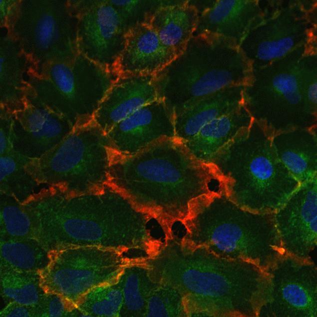 A549 cells were incubated with EGF for 2 minutes to induce phosphorylation of EGFR on cell membrane surfaces. Phosphorylated EGFR (red) was labeled with rabbit anti-pEGFR (Y1068) and detected using the Alexa Fluor 594 Tyramide SuperBoost Kit with Goat anti-Rabbit IgG (Cat. No. B40925). Total EGFR (green) was labeled with anti-EGFR antibody and detected with Alexa Fluor 488 secondary antibody. Nuclei (blue) were labeled with NucBlue™ Fixed Cell ReadyProbes™ Reagent (Cat. No. R37606) and cells mounted with Prolong™ Diamond mountant (Cat. No. P36961). Images were takes using a confocal microscope.