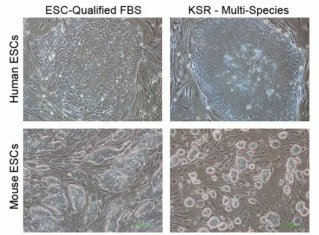 H9 human embryonic stem cells (ESCs) were cultured on mouse embryonic fibroblasts (MEFs) with 20% ESC-Qualified Fetal Bovine Serum (FBS) or 20% KnockOut SR – Multi-Species. 129S6 mouse ESCs were cultured on MEFs using 15% ESC-Qualified FBS or 15% KnockOut SR – Multi-Species. Human ESC colonies were more compact in KSR – Multi-Species compared to FBS. Mouse ESCs in KSR – Mutli-Species were dome-shaped and more compact than in FBS.