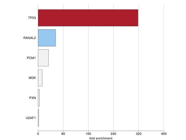 IP-MS enrichment of TP53 (LFQ intensity): TP53 was enriched 318-fold from BT-549 lysate compared to background proteins, using the optimized IP-MS workflow with Pierce MS-Compatible Magnetic IP Kit protein A/G (Part No. 90409) and TP53 antibody (Part No. MA5-12557). See more information on IP-MS verification of antibody selectivity. Red color identifies the antibody's intended target, and blue color identifies direct interactors of that target protein.