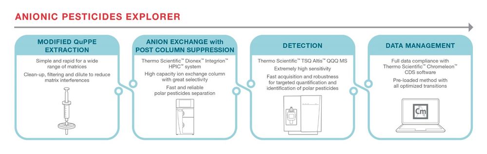 The instrumentation comprises the Thermo Scientific™ Dionex Integrion High-Performance Ion Chromatography system coupled with the Thermo Scientific™ TSQ Altis Triple Quadrupole MS. It comes complete with optimized sample preparation, software, necessary consumables, suitability check standard solution and a detailed deployment guide to enable food testing laboratories to overcome the challenge of reliable quantitation and identification of multiple polar anionic pesticides.