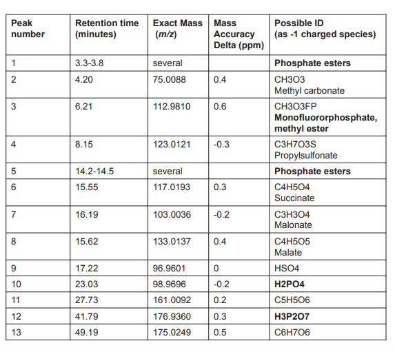 Figure 1 shows the anion-exchange separation of components from the wash of an anode exhibiting 45% loss in capacity. Many of these analytes increase in concentration with anode capacity loss. Anions elute in this separation in order of valency on the anion exchange column but are detected as singly-charged ions in the mass spectrometer. Inorganic anions sulfate (-2 charge), phosphate (-3 charge) and pyrophosphate (-4 charge) are noted.