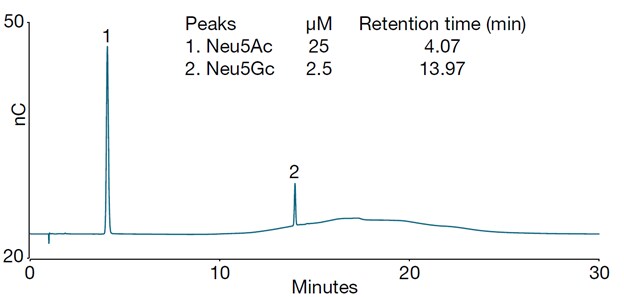 Figure 1. Separation of N-acetylneuraminic acid (Neu5Ac) and N-glycolylneuraminic acid (Neu5Gc) standards using a Dionex CarboPac PA20-1 mm column.