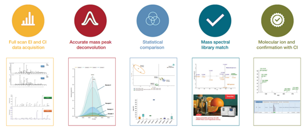 Figure 1. Workflow from left to right showing how from data acquisition in full scan we move from peak detection, to identifying unique components in a sample, to finally making a compound identification.