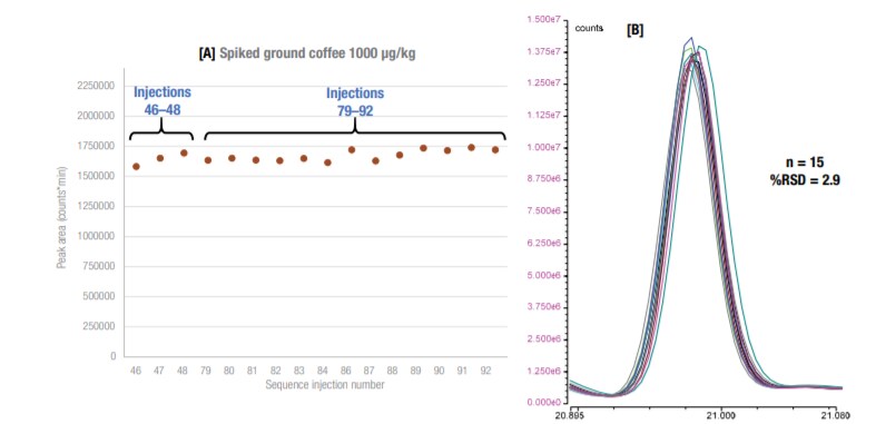 [A] Robustness data shown as consistent peak area counts for acrylamide determined in QC ground coffee samples spiked at 200 ppb (equivalent to 1000 µg/kg), analyzed mid (inj. no. 46–48), and end (inj. no. 79–92) of a 99-injection analytical sequence, containing derivatized blanks, calibration standards, crisp, instant coffee, and ground coffee samples. [B] overlaid EIC (m/z 128) of the QC ground coffee sample (n=16 injections) analyzed across the whole analytical sequence. For all QC ground coffee samples containing acrylamide at the 200 ppb level across the analytical sequence of 99 injections, the calculated %RSD absolute peak area counts was 2.9.