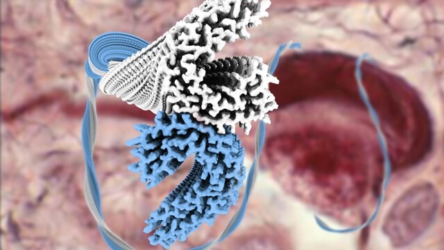Using cryo-EM, researchers solved the structure of tau filament structures, rendered in blue and white in this photo. Knowing how tau proteins assemble into their filaments is expected to lead to more targeted treatment of Alzheimer’s.(Source: Technology Networks)