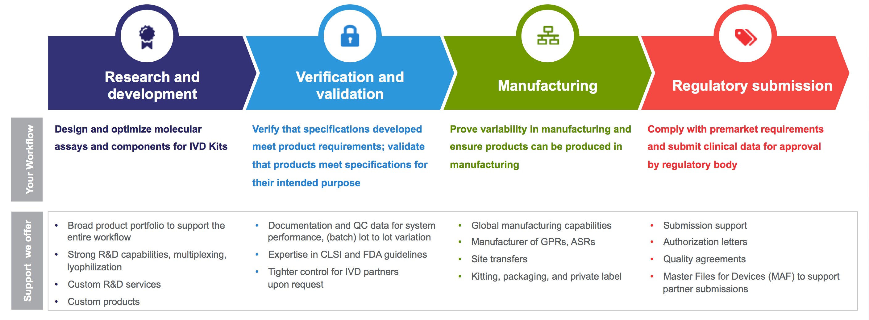 Regardless of the indication, complexity, and technology involved in your molecular diagnostic assay, the steps you will take are fairly consistent. Your product vendor should have the experience and the ability to partner with you in each of these steps to help you get through the process smoothly.