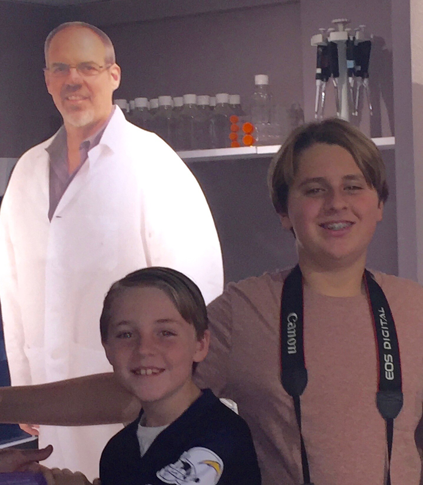 Jon Chesnut’s children enjoying their father’s cardboard cutout at the stem cell exhibit in the Reuben H. Fleet Science Center, San Diego