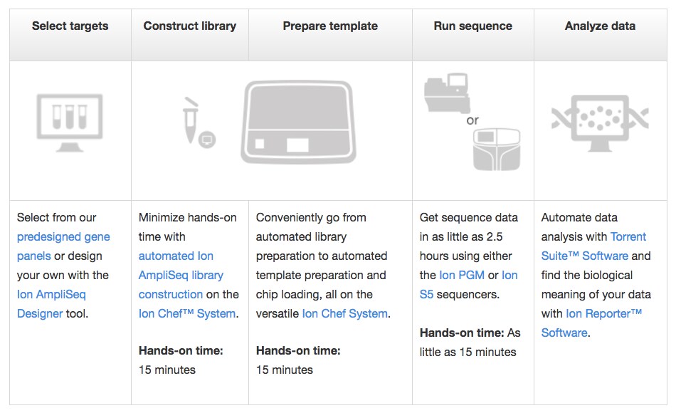 Ion Torrent AmpliSeq Designer is an online assay design tool that enables you to design and order custom or pre-designed gene panels. You can design panels by uploading your own reference genes or build from a pre-designed panel by adding or removing specific genes. Panels are delivered in tubes of pre-pooled, multiplexed primers in ready-to-use concentrations. The Ion Chef™ System automates library preparation for Ion AmpliSeq 1- and 2-pool designs using pre-packaged library reagents and primers for up to 8 samples in a single run. It also automates template preparation and chip loading. Sequencing can then be run on the Ion S5™ System and is typically completed in less than 4 hours. That’s less than 24 hours from DNA to data (with overnight Ion Chef System run) with about 45 mins of hands-on time.