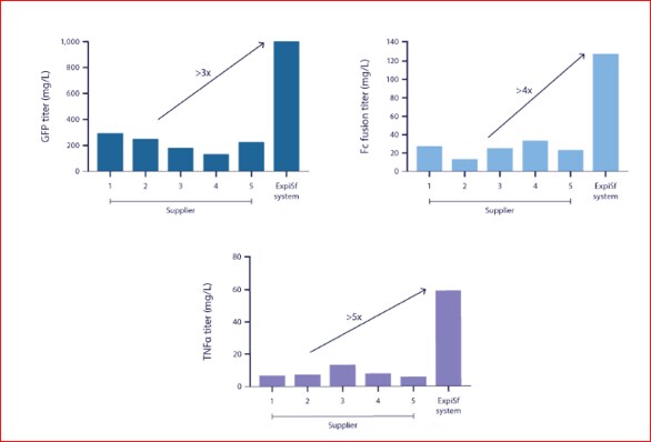The ExpiSf system outperforms existing insect platforms. In performance tests against other suppliers’ media, the ExpiSf system demonstrated greater protein expression, delivering 3x more protein.