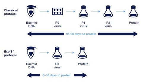 The ExpiSf system delivers protein in half the time. Bacmid DNA transfection in suspension using the ExpiSf system allows for efficient baculovirus generation without the need for virus amplification, delivering protein in as few as 6 days.