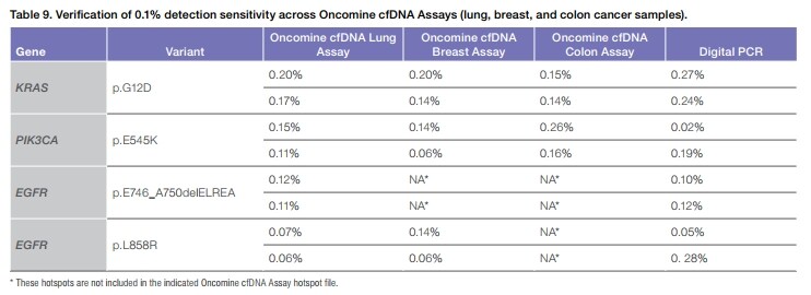 The low allele frequency of 0.1% was confirmed using NGS across three different Oncomine cfDNA Assays (lung, breast, and colon cancer samples), with orthogonal verification using dPCR.