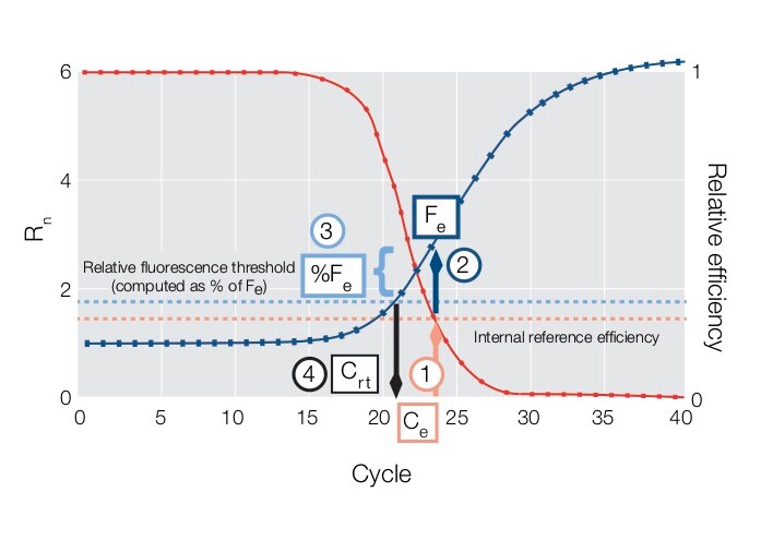 - A predetermined internal reference efficiency level (pink dotted line) is used to identify the fractional cycle (Ce) where the reaction efficiency curve (model) reaches a specific value.