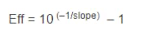 The efficiency of the PCR should be 90–110% (3.6 > slope > 3.1). A number of variables can affect the efficiency of the PCR including length of the amplicon, secondary structure, and primer design, to name a few. Although valid data can be obtained that fall outside of the efficiency range, the qPCR should be further optimized, or alternative amplicons designed.