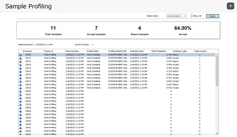 Using the sample prediction function, you can select a sample to calculate its probability of its target test of being “true” and its corresponding label. The results of the samples’ predictions are solely for informative purposes and are not stored within SampleManager LIMS software.