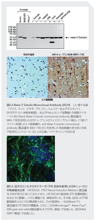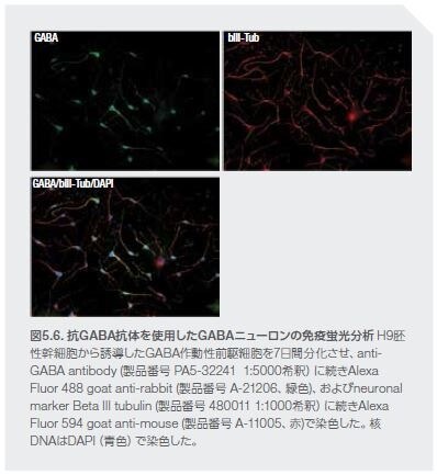 ニューロンの分化中、NSCは進行性の細胞系譜の制限を受け(図5.2)、グリア前駆細胞(CD44+/A2B5+)が形成され、アストロサイト(GFAP+)(図5.3)およびオリゴデンドロサイト(Galc+およびO4+)となります。細胞系譜の制限における他の分岐には、ドーパミン作動性(DA)ニューロン(図5.5)、GABA作動性(GABA)ニューロン(図5.6)、および運動ニューロンなどの様々なタイプのニューロン(図5.4)の形成につながる神経系統の経路があります。NSCの単離法、PSCからのNSCの誘導法、および in vitro での増殖法の開発における進歩は、NSCを基礎的な発達研究や細胞療法のための有望なツールとして使用することを可能としました*2。