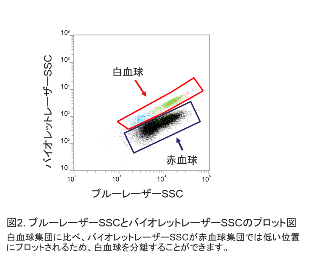 ブルーレーザーとバイオレットレーザーの側方散乱光(Side Scatter: SSC)を同時に使用することで、全血サンプルから白血球を分離することが可能です。白血球と赤血球ではバイオレットレーザーにおいて、異なる散乱特性があります。赤血球はバイオレットレーザーの光を吸収するために、白血球に比べ光強度が低くなります。