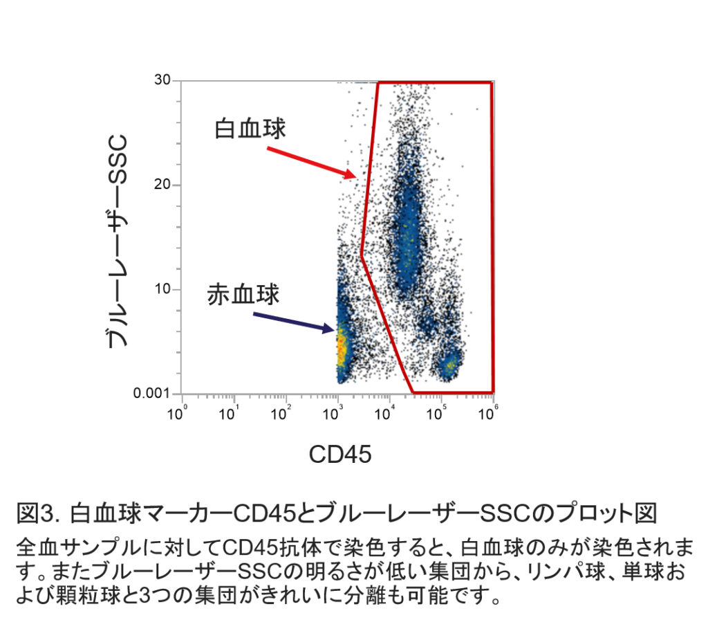 フローサイトメーターにおいて、研究対象として多く使用されている細胞は、血液細胞です。血液中の白血球を解析する場合、白血球数に比べ1,000倍以上の細胞数が存在する赤血球のデータの漏れこみが問題となります。多くの場合赤血球を除去するために、溶血処理や遠心操作を行います。それらの操作は煩雑であり、また細胞へのダメージやロス、凝集を起こすことがあります。