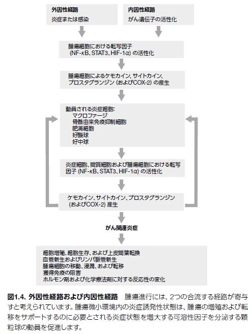 消失しない慢性的な病的炎症は、自己免疫疾患や炎症性疾患、線維症や組織変性、およびがんなどの重篤な医学的症状の発症に関連している可能性があります。慢性的な病的反応は、多くの異なるメカニズム(遺伝的不安定性、異常な細胞応答、および腫瘍微小環境の形成をサポートし、免疫回避に寄与するケミカルメディエーター)によって腫瘍形成を誘導します。炎症や感染に関連する発がん促進過程は、内因性経路のイベントに分類されるのに対し、炎症を促進する発がん性変異に寄与する遺伝子変異は外因性経路に関連するイベントと考えられます(図1.4)。