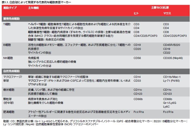 炎症反応の伝播や消退のプロセスには、複数の異なるタイプの細胞が関与しています。さまざまな細胞タイプの主な機能細胞表面マーカーを表1.1に示します。