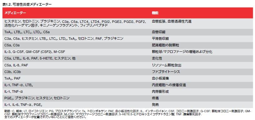 損傷細胞や活性化細胞から放出される可溶性タンパク質や化学物質は、炎症過程を制御します。これらの物質およびその受容体の作用を表1.2に示します。