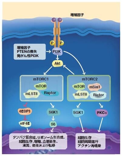 癌増殖因子、PTEN喪失、または体細胞変異によって活性化したPI3Kは、AktおよびmTORC複合体の活性化に寄与します。
