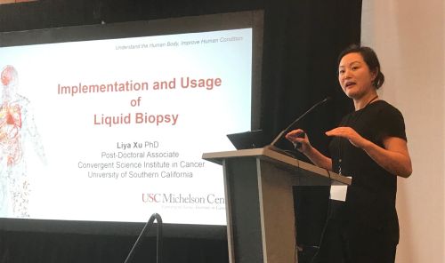 リキッドバイオプシーとは血液や他の体液の生化学的な特徴を検査することです。組織の生検に代わりうる新たな選択肢として研究と医学の両分野で注目されています。Liya Xu博士(University of Southern California Michelson Center for Convergent Biosciences)は、高解像度シングルセル解析プラットフォームに関する研究を紹介してくれました。リキッドバイオプシーから得たcell-free DNA(cfDNA)を解析するために、Oncomine アッセイが使用されていました。チームはあるがん患者の病気を、治療に対するレスポンスやがんの進化を含め、可能な限り網羅的に再現するところから始めました。この目的を達成するために、ER陽性HER2陰性の転移性乳がん患者からのサンプルを解析しました。サンプルは11の治療ラインを含む、治療の全工程から複数点採取し解析しています。