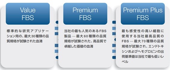 Gibco血清は、Value FBS、Premium FBS、Premium Plus FBSに分かれており、各グレードのコンセプトは以下のとおりです。