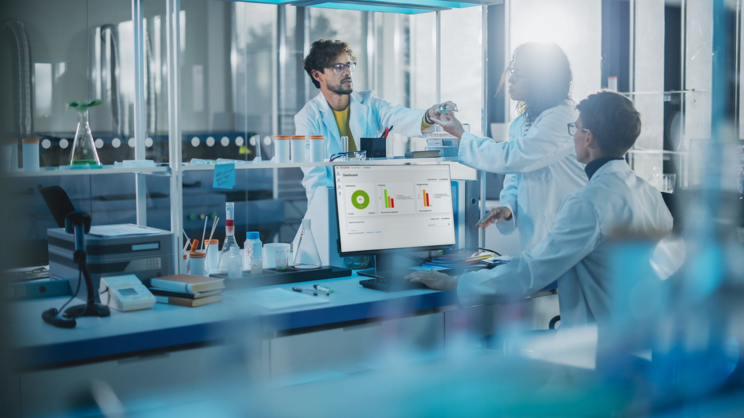 データやプロセスを統合させることができるラボラトリー情報管理システム(LIMS)を導入することで、製薬会社は複数のラボの情報を、サーバー、もしくはクラウド上のプラットフォーム上で、1つに連携させることができます。それにより、すべてのラボに対し、リアルタイムのデータアクセスと共有が可能になります。企業全体で自動化されたデータ管理システムを使用することで、業務効率が向上し、プロセスを合理化することができるのです。