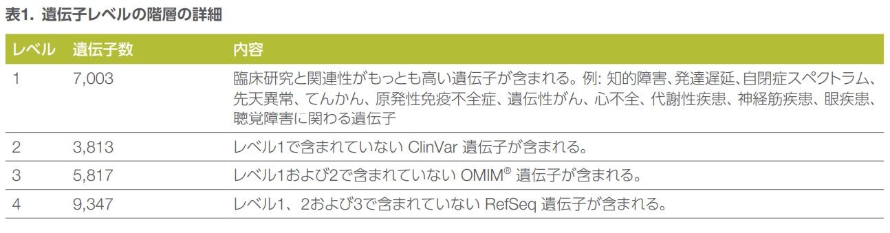 ユーザーフレンドリーな ChASソフトウェアに遺伝子レベルの tier analysis を組み込むことで、柔軟かつ新しい手法が実現します。臨床研究の関連性に基づき遺伝子レベルの 階層ごとに結果を表示できます。この独自の機能により、臨床的に重要な遺伝子 (レベ ル1) に絞り込んでコピー数多型を表示することや、遺伝子レベルの階層を全ゲノムに広げることもできます (表1)。そのため、目的とする遺伝子レベルの階層を決定し、解析およびレポート作成を行うことができます。