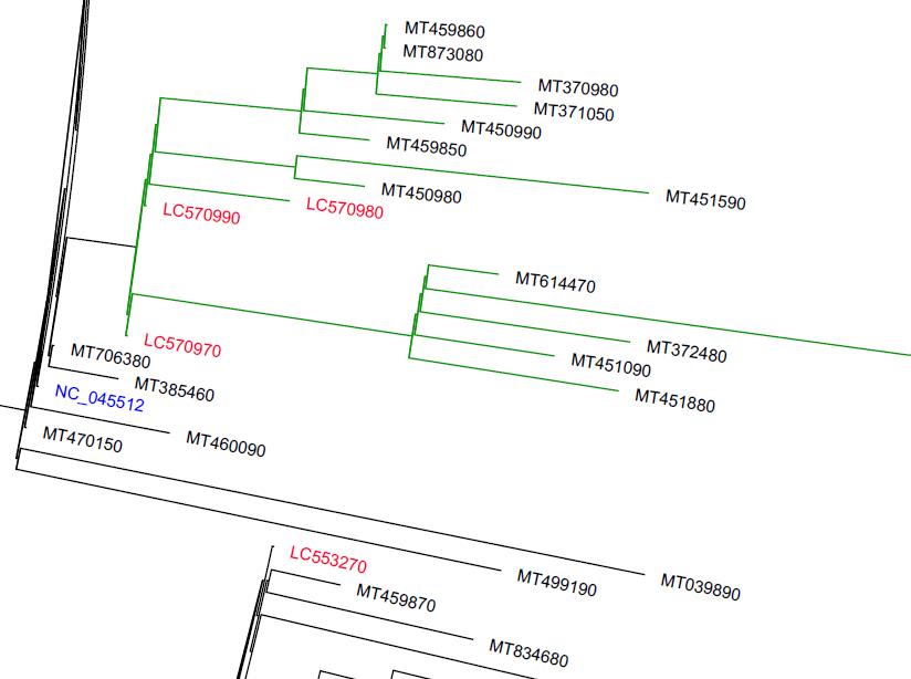 Figtreeを用いて編集した系統樹の一部を図に示します。各ウイルスゲノム配列は登録アクセッション番号で示されています。日本の施設から登録された配列を赤字で、それらの配列を含む群の枝を緑で、また参照配列として使用した配列(NC_045512)を青字で表示するなど、注目したい配列を色分けして結果をわかりやすく示すことができます。