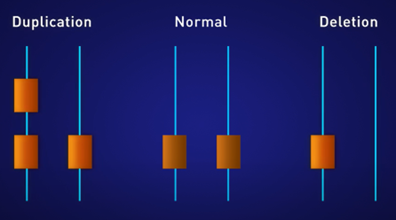 コピー数多型解析(Copy Number Variation:CNV)はゲノムに生じた変異で、ゲノムDNA配列のコピー数が、リファレンスやスタンダードと異なるものを指します(図1)。コピー数が増えるAmplificationと、コピー数が減るDeletionがあります。挿入、欠失、逆位、転座といったゲノム上の変化がCNVを引き起こします。CNVはヒトゲノムでもよく見られる遺伝子変異の一つで、がんや遺伝性疾患を含め、数多くの疾患に関係しています。