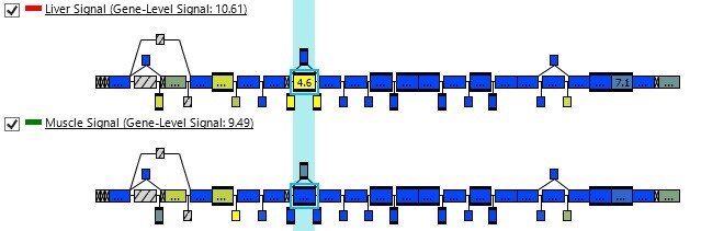 上図では選択されているエクソン領域において、Liverでは黄色(=発現量が小さい)、Muscleでは青色(=発現量が大きい)に表示されています。つまり、Liverにおいて黄色のエクソンがスプライスアウトされている可能性が高いことが推測されます。