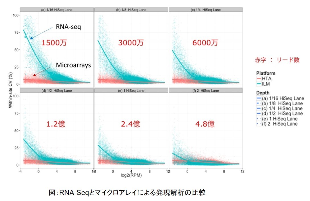 マイクロアレイにはRNA-Seqのようにリード数という概念がありません。しかしRNA-Seqではリード数によってその精度に違いが生じます。RNA-Seqとマイクロアレイの発現精度の違いとして、下図のようなデータがあります。