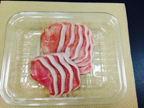 サンプルは、スーパーマーケットで市販されている豚タンを購入した(図1)。購入した豚タンをカッターで約1cm角に切った。この豚タンをクリオスタット内にセットした試料チャック上に静置し、クリオマトリックスコンパウンドで包埋した。そして Thermo Scientific クリオスター NX70の凍結バー機能を利用して、凍結を行った。切片の作成にはMX35 Ultraの替刃を用い、厚み10μmの切片を薄切りした。試料ヘッドと替刃は-20°Cで温度制御した。切片をカラーフロストプラススライドホワイトに乗せたものを蛍光染色に用いた。