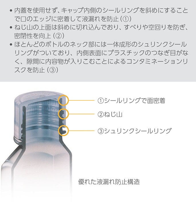 各容器は上下を反転させたうえで、2 psiで2分間加圧し、その後、ボトルは、テストキャップを取り外した際にねじ山が濡れていないこと、キャップは、試験ボトルのねじ山が濡れていないことを確認することで、液漏れ防止機能が確認されます。