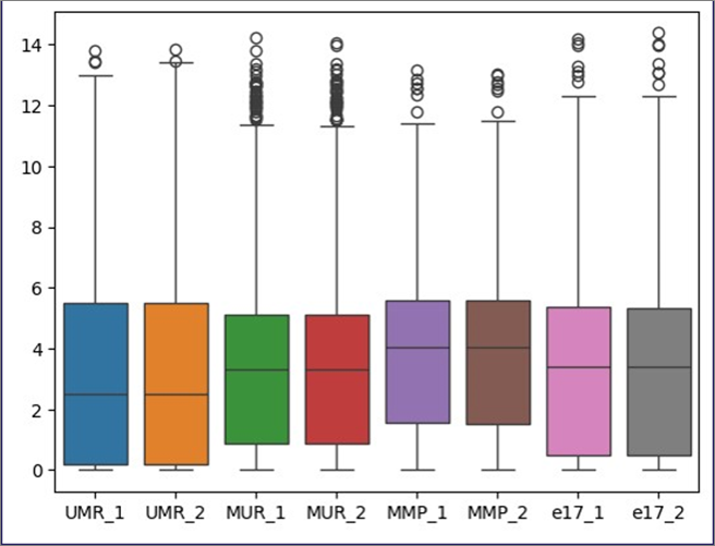 4つのコントロールRNAサンプルをレプリケートで解析していますが、レプリケート同士の相関が非常に高いことがわかります。