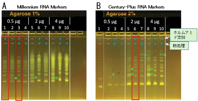 A: Millenium RNA Markers(E-Gel EX 1%ゲル)、B:Century-Plus RNA Markers(E-Gel EX 2%ゲル)。RNA量は0.5、2、4 µgの3パターン、ホルムアミドは添加・未添加(+・-)の2パターン、熱処理あり・熱処理なし(+・-)の2パターンについて試した。それぞれについて試した中で最適と思われる結果を赤枠で囲った。*:ゴーストバンド(RNAの2次構造形成により出現したと思われるバンド)。
