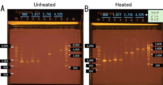A: 熱処理なしB: 熱処理あり。共にE-Gel EX 1%ゲル。RNAフラグメントのサイズは868、1,017、2,716、4,525ベースの4種類。全て100 ng。M:RiboRuler High Range RNA Ladder(1 µg)、9:Millennium™ RNA Markers(1 µg)。1、3、5、7:未精製サンプル、2、4、6、8:精製サンプル。
