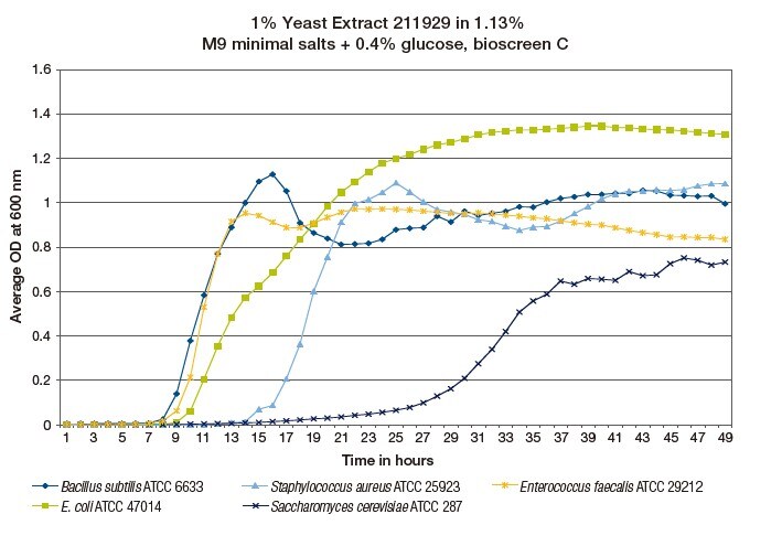 AOFプトンは、大腸菌(E.coli)を用いて医薬品原薬または医薬品原材料を製造する際に有用な基本培地の一つとなります。大腸菌にとって主要な栄養源であると同時に、バッファーとしての役割も果たします。多くのペプトンでは培地中に最大30 g/L程度の割合で使用することが推奨されています。使用例として図1にお示ししました。こちらの図から、酵母ペプトンを用いた培養は大腸菌が最も適していることがうかがえます。