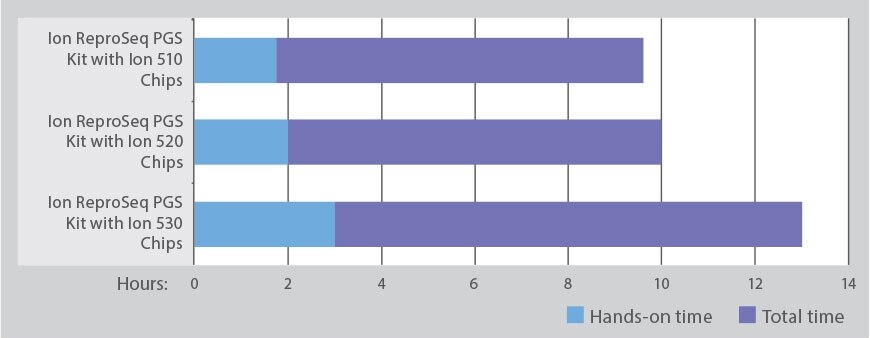 通常不妊治療において、1サイクルで6~10個の胚が得られます。胚を用いた着床前の遺伝子解析では、これらの胚から取り出した細胞を使用して、妊娠の成功につながる可能性のある胚を選択します。したがって、胚を母体に戻すタイミングは非常に重要であり、24時間以内に23対の染色体の包括的な解析結果を得ることが望まれます。Ion Torrent システムを用いた遺伝子解析は約10~13時間以内に複数のサンプルの23対の染色体の包括的な解析結果が1回のシーケンスで得られます。
