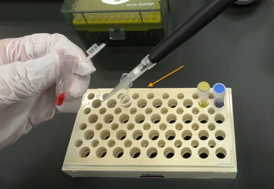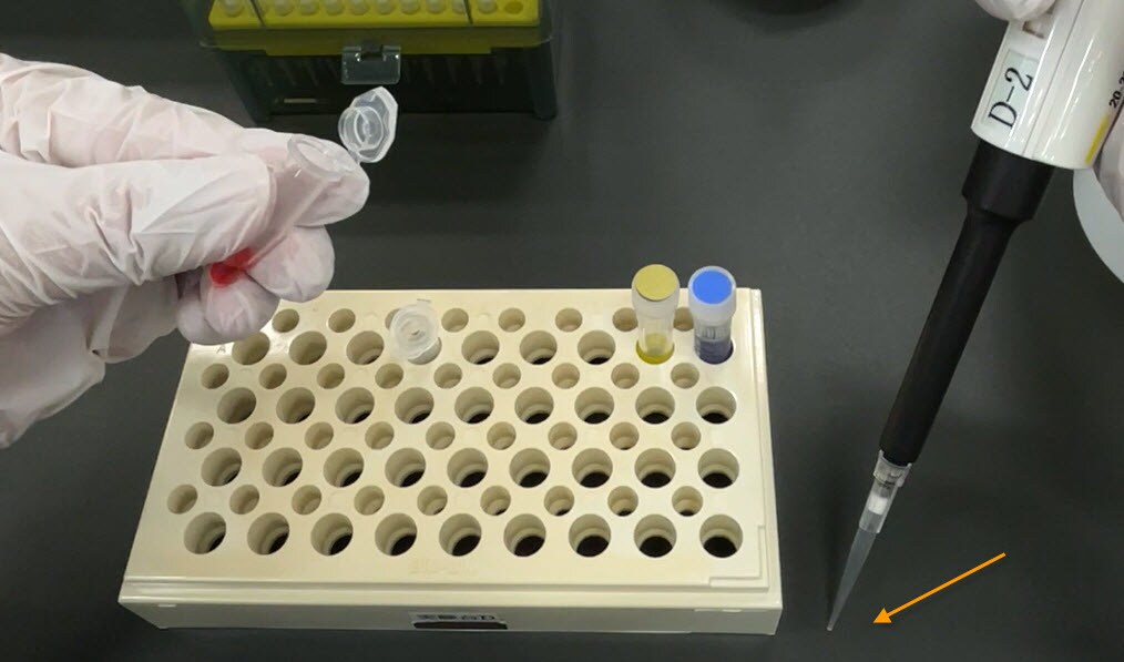 マイクロピペットにチップを装着し、反応チューブのフタを開けて、試薬の分取や分注を行う順番での方法。この動画では「あえて」コンタミネーションが生じやすい操作を強調しています。