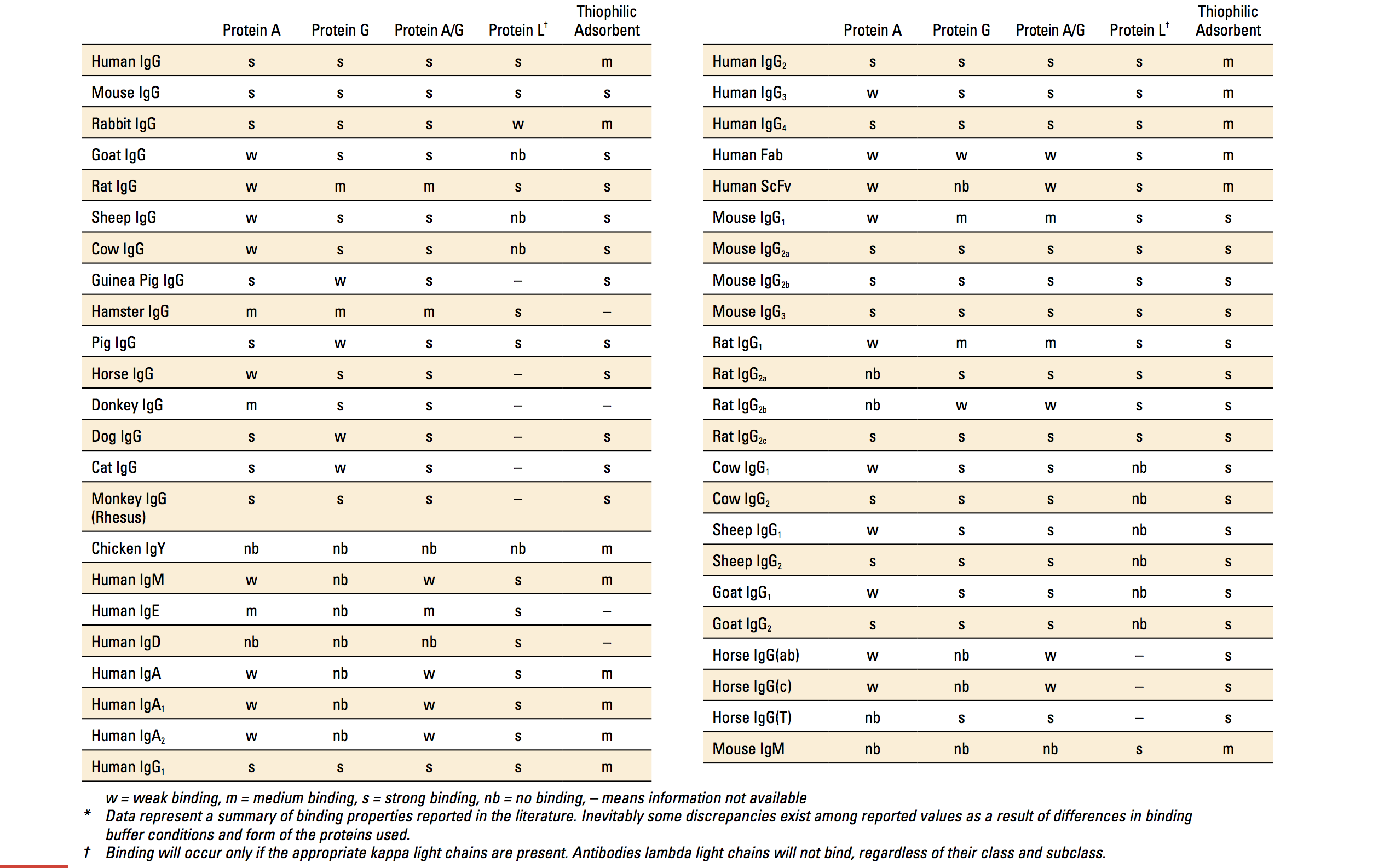 Protein Aと免疫グロブリンとの結合性は抗体の動物種やサブクラスにより異なります(表)。 例えばヒトIgG1, IgG2, IgG4には強く結合しますがヒトIgG3とはほとんど結合しません。またマウスIgG2a, IgG2b, IgG3には強く結合しますがマウスIgG1とのアフィニティーは、生体条件のバッファー(Tris-HClやリン酸ナトリウムバッファー)中では弱くなります(ただし、Pierce™ Protein A IgG Binding Bufferを使用すればマウスIgG1を他のサブクラスに近いアフィニティーで結合させることができます)。抗体精製においては、Protein Aは一般的にウサギのポリクローナル抗体精製によく利用されます。