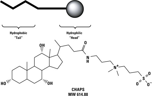 図1 界面活性剤分子のイメージ図(上図)と両イオン性界面活性剤(CHAPS)の構造式(下図)