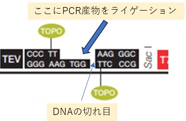 このクローニングサイトは当社独自のDirectional TOPO™クローニングベクターです。これらのクローニングサイトは、この位置で予め切断・線状化されているので制限酵素で切る必要はありません。ここにPCRで増やしたGOIをライゲーションします。ここでは製品の詳しい説明は控えますが、もしご興味があれば製品情報(製品番号:K15101)をご確認ください。また、シリーズ第1回のメモ3で少しだけ説明していますのでよろしければご参照ください。