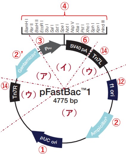 昆虫細胞発現に使用する組み換えバキュロウイルス作成用ベクターです。組み換えバキュロウイルスを作成する方法は複数開発されていますが、このベクターは当社のGibco™ Bac-to-Bac™ Baculovirus Expression System用です。昆虫細胞で機能するポリヘドリンプロモーター(pPH)とバキュロウイルスゲノム(Bacmid)との組み換えサイト(Tn7R、Tn7L)があることが特徴です。なお、(ア)と(ウ)が二か所ずつあり複雑ですが、3領域に分類済みです。番号は先程の例と同様です。