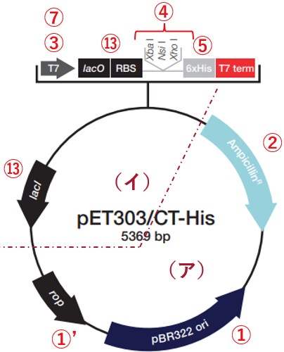 先程と同じpETシステムを用いた大腸菌発現系用ベクターです。大きな違いはN末タグの代わりにC末タグ(6xHis)を付けられる点と、クローニングサイトが異なる点です。例1と同様(ア)、(イ)の2領域に分類済みです。各エレメントに付けた番号についても同様です。