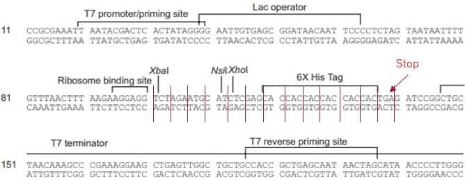 なお、このベクターの場合、注意する点はこの後に示す2点です。また、それらを考慮するには以下のようなクローニングサイト周辺の塩基配列情報が必須です。6X Hisタグの読み枠を赤線で書き込み、翻訳終止コドン(Stop)を明示しました。