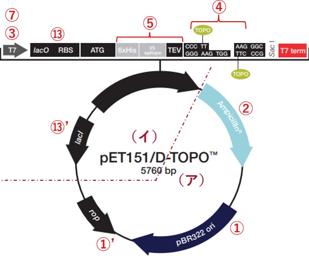 目的遺伝子(GOI)を大腸菌で大量発現させるためにこのベクターを入手し、マップとマニュアルを見て使い方を考えているという状況を想定しています。マップは下記ですが、既に(ア)・(イ)の領域に分類済みです(このベクターは大腸菌以外の宿主では使いませんので(ウ)の領域はありません)。また、エレメントの一部にナンバーを付けました。数字はエレメント説明用の図と対応しています。できるだけ自力で理解を深められるのはいいことですが、何かわからないことなどあれば当社の製品ですので当社テクニカルサポートにお問い合わせください。